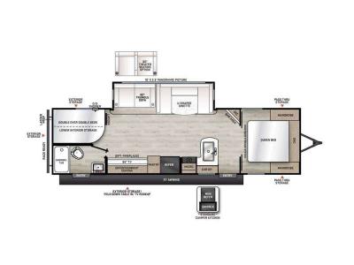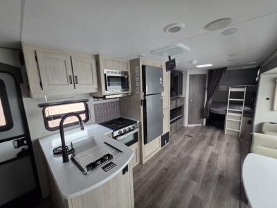 This travel trailer is perfect for your whole crew! Once you arrive at the campground, you can put out the 21' electric awning and start lunch on the exterior camper kitchen with a griddle and mini fridge. There is also a pass-thru storage plus additional exterior storage with a fold-down table and a TV hookup for added convenience. And since there are dual entry doors found on this unit, you can enter in through the full bath in the back, or the main living area towards the front! A large slide provides ample space to move about, and you'll find a trundle sofa and U-shaped dinette here for cozy seating and sleeping space. Speaking of sleeping, there is a front RV queen bed in the bedroom plus double-size bunks in the back for guests!