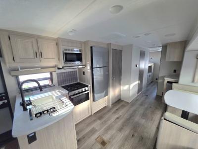 If you enjoy hiking, biking, and fishing, and waking up to beautiful scenery from your own comforts, then start camping with this trailer at the campsite! You will be able to sleep like a queen on the walk-around bed with dual wardrobes and overhead storage for more items in the front private bedroom while your family or friends have their own privacy in the bunkhouse complete with two bunks, a jack knife sofa with storage totes below and a TV/wardrobe cabinet for even more storage. The full bathroom includes the second entry/exit door for convenience when outside under the 21' electric awning with multicolor LED lights, or while cooking using the full-size camper kitchen along the exterior. There are full kitchen amenities inside including a 10.7 cu. ft. refrigerator and a pantry.