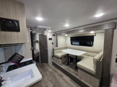 This spacious travel trailer can sleep eight campers each night thanks to the double-size bunks in the back, the U-shaped dinette within the slide out, and the queen bed up front! You can easily make meals for your crew with the two burner cooktop and microwave oven, and leftovers can go in the 10.7 cu. ft. 12V refrigerator! After you've cleaned up in the full bath, head outdoors to relax under the 15' power awning with multicolor LED lights and a remote!