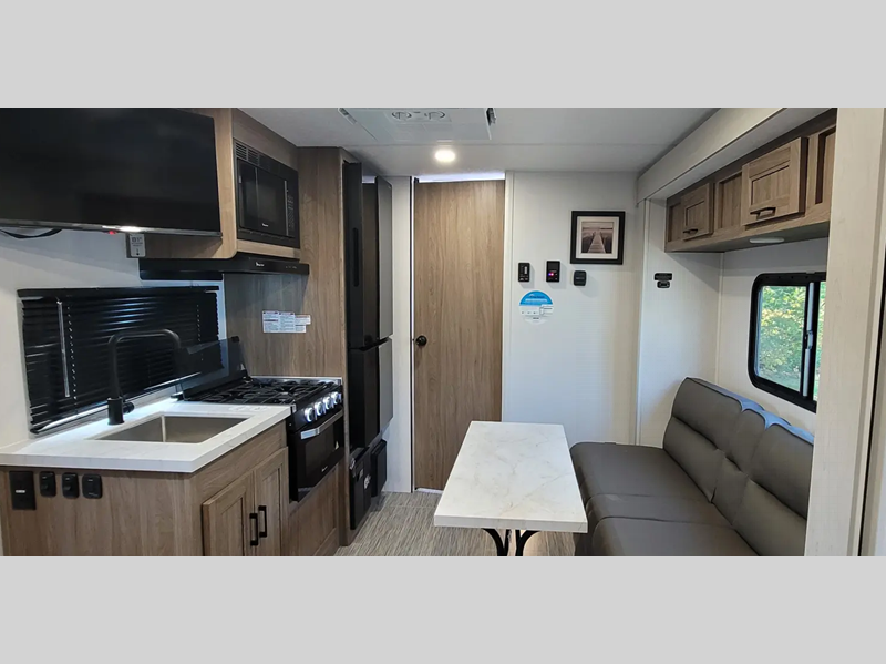 Sleeps 5 Slides 1 Length 28 ft 2 in Ext Width 8 ft Ext Height 11 ft 3 in Int Height 6 ft 9 in Hitch Weight 594 lbs GVWR 7000 lbs Dry Weight 5356 lbs Cargo Capacity 1644 lbs Fresh Water Capacity 52 gals Grey Water Capacity 35 gals Black Water Capacity 35 gals Available Beds Queen Refrigerator Type 12V Double Door Refrigerator Size 10 cu ft Cooktop Burners 2 Shower Size 32" Number of Awnings 1 Water Heater Type Suburban Tankless AC BTU 15000 btu TV Info 40” Smart TV Awning Info 18' Velarium Velocity Switch Power Awning w/ Light Strip Axle Count 2 Shower Type Radius Similar Floorplans