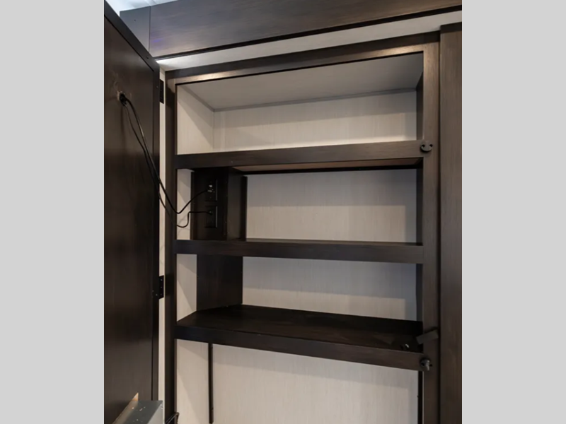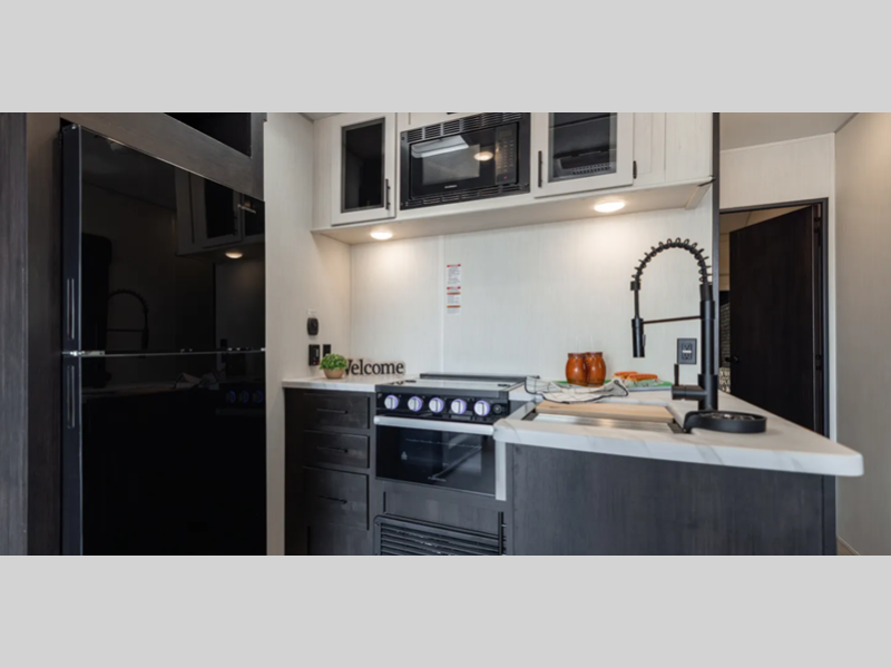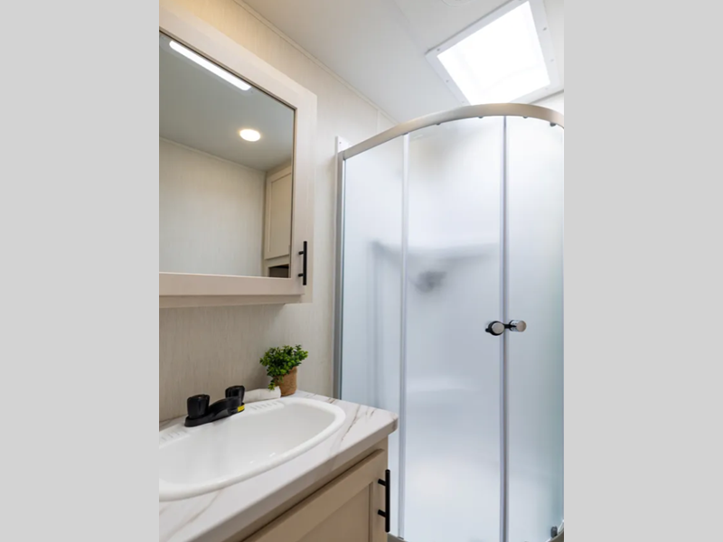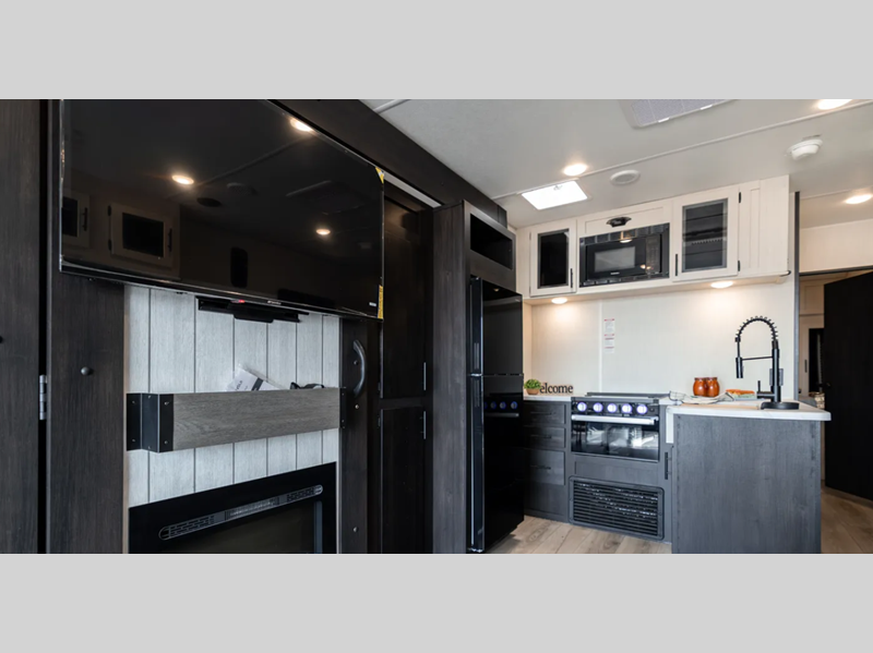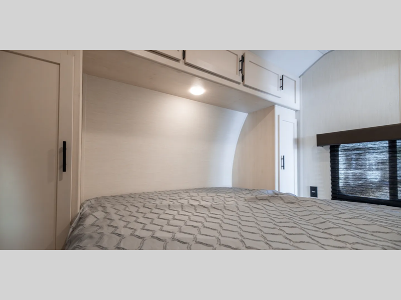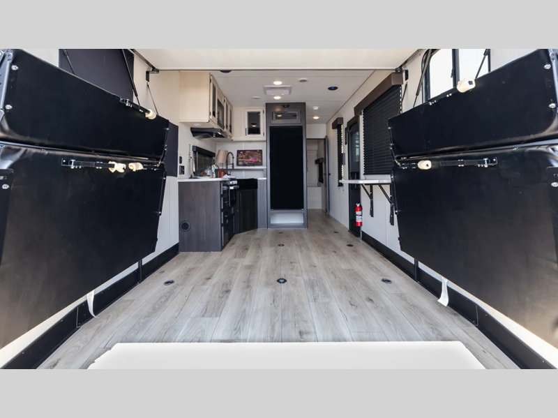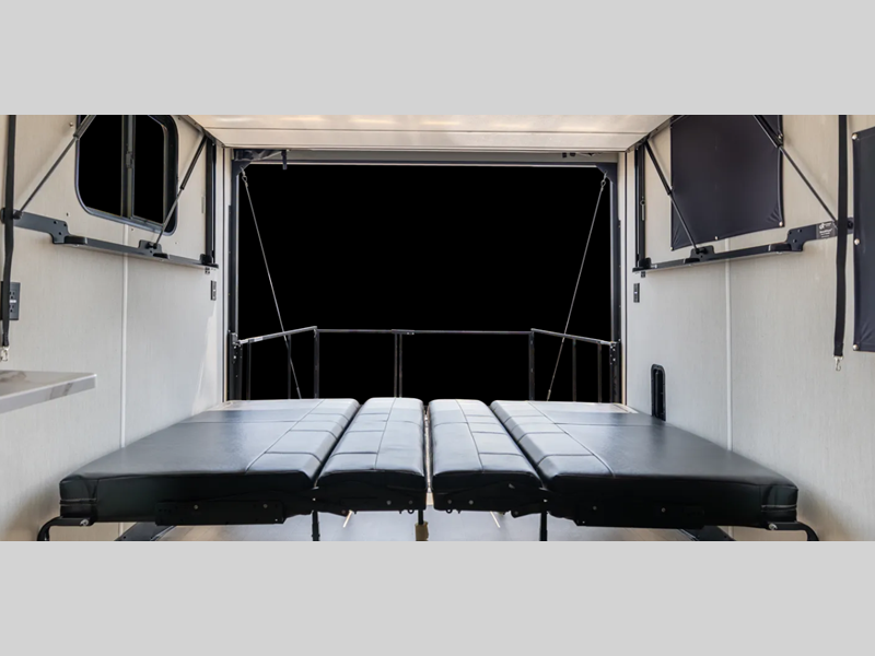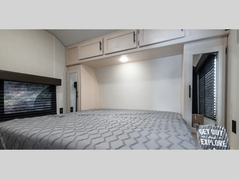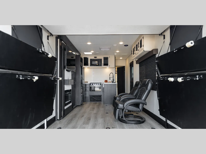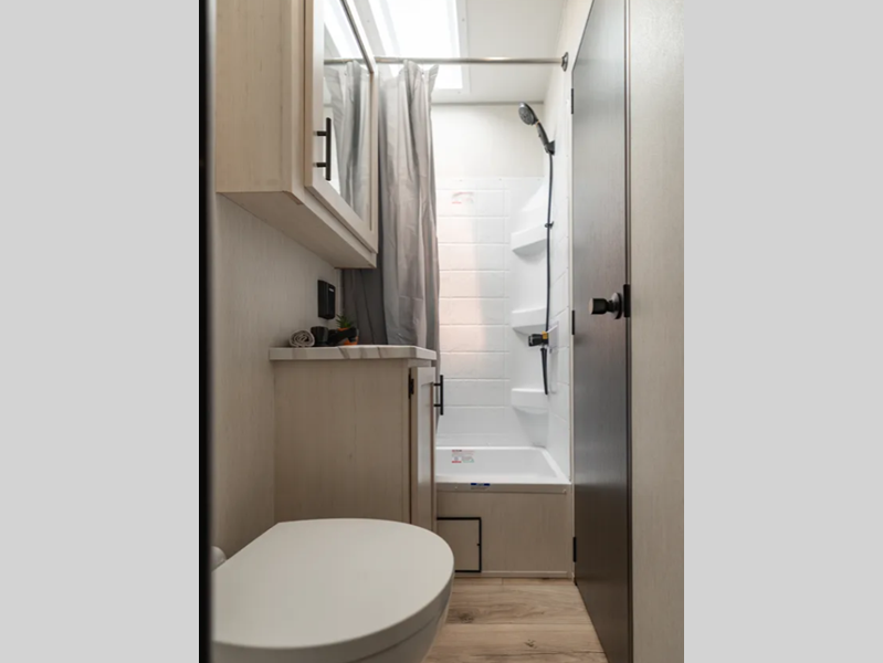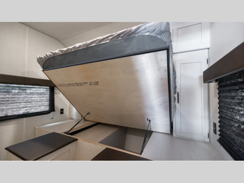 Each model is constructed with an armored underbelly tank enclosure and forced air heat to all holding tanks for added protection against the elements. The outside shower with hot and cold water means you can wash off your toys after trail riding, and the power awning will provide an inviting outdoor space to relax. Inside, you'll enjoy seamless countertops, zebra shades, a tankless on demand water heater, and more convenient features.
