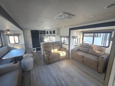 One look at this spacious travel trailer and you'll be sold! The rear kitchen features a U-shaped counter, an 11-cu. ft. refrigerator, plus a pantry for dry goods and snacks. There is a 1/2 dinette with bench seating, plus a tri-fold sofa and two theater seats. Everyone can take turns cleaning up in the full bath that includes a shower with a seat, then head outdoors to relax under the patio awnings with LED lights. When it's time for bed, you will enjoy the king bed slide out in the front bedroom. You'll also find a dresser and a closet here, plus a wardrobe with washer and dryer prep if you choose to add those appliances!