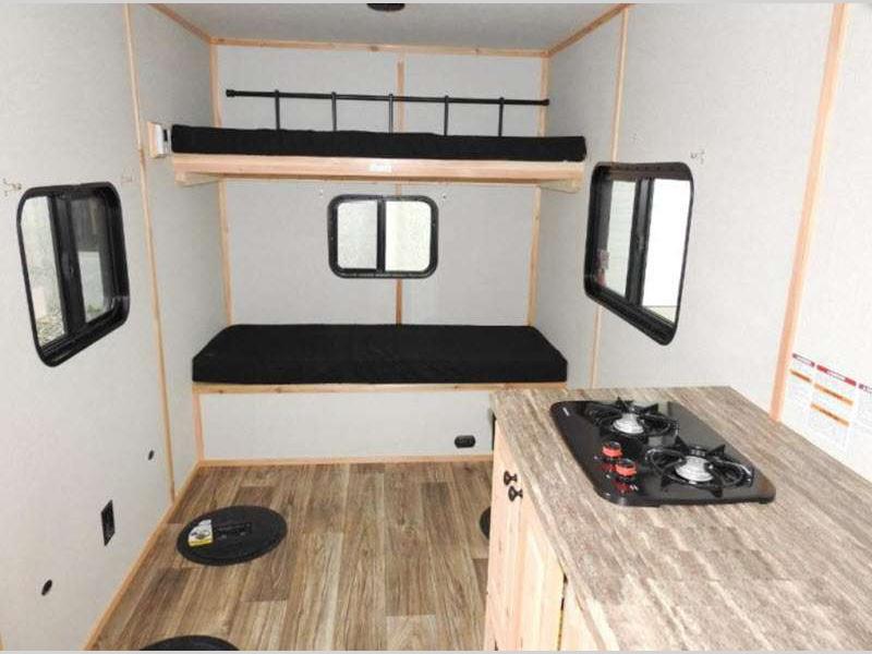 Sleeps 4 Length 16 ft Ext Width 8 ft Exterior Color Black Onyx, Snow White, Pewter, Copper, Medium Charcoal, Yellow, Orange, Red, Brandywine, Shamrock Green, Glacier Blue, Navy Blue Hitch Weight 395 lbs GVWR 5500 lbs Dry Weight 4280 lbs Furnace BTU 20000 btu Number Of Bunks 3 Cooktop Burners 2 LP Tank Capacity 30 lbs Axle Count 1 Number of LP Tanks 2 Similar Floorplans