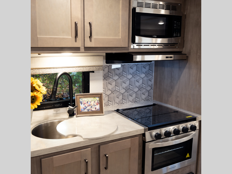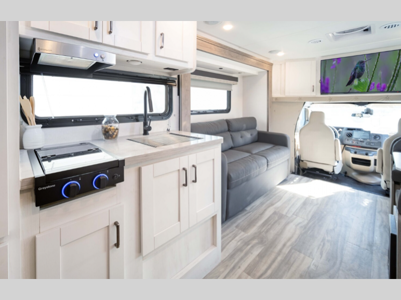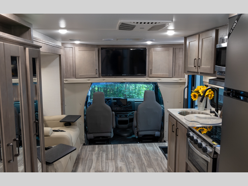 Sleeps 3 Slides 1 Length 24 ft 10 in Ext Width 8 ft Ext Height 10 ft 6 in Int Height 6 ft 5 in Interior Color Smoke, Fog Exterior Color Standard Graphics, Full Paint Option, Partial Paint Option GVWR 12500 lbs Dry Weight 9963 lbs Cargo Capacity 2537 lbs Fresh Water Capacity 37 gals Grey Water Capacity 38 gals Black Water Capacity 38 gals Furnace BTU 25000 btu Generator 4.0 kW Enclosed Fuel Type Gasoline Engine 7.3L V8 Chassis Ford E-350 Fuel Capacity 55 gals Available Beds RV Queen Refrigerator Type 12V Double Door Refrigerator Size 8 cu ft Cooktop Burners 3 Number of Awnings 1 LP Tank Capacity 42 lbs Water Heater Type Tankless AC BTU 13500 btu Awning Info Power w/LED Lights & Speakers Shower Type Tub/Shower Combo -