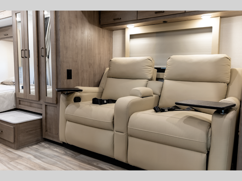 Each is built with a one-piece radius roof, a laminated steel frame floor with an underbelly, plus fiberglass exterior walls with Azdel for added durability. You can choose a model with a Ford E350 or Ford E450 chassis, or choose the Chevy Express chassis model if you prefer. Whichever model you choose, you'll be met with upgraded designer graphics and interior fabrics, vinyl flooring throughout that is easy to keep clean, a deluxe comfort mattress, any many more comforts.