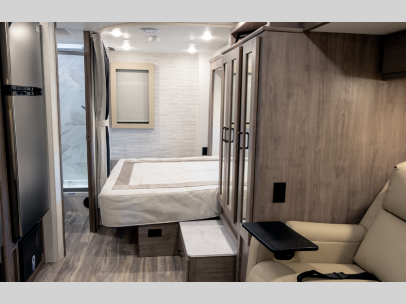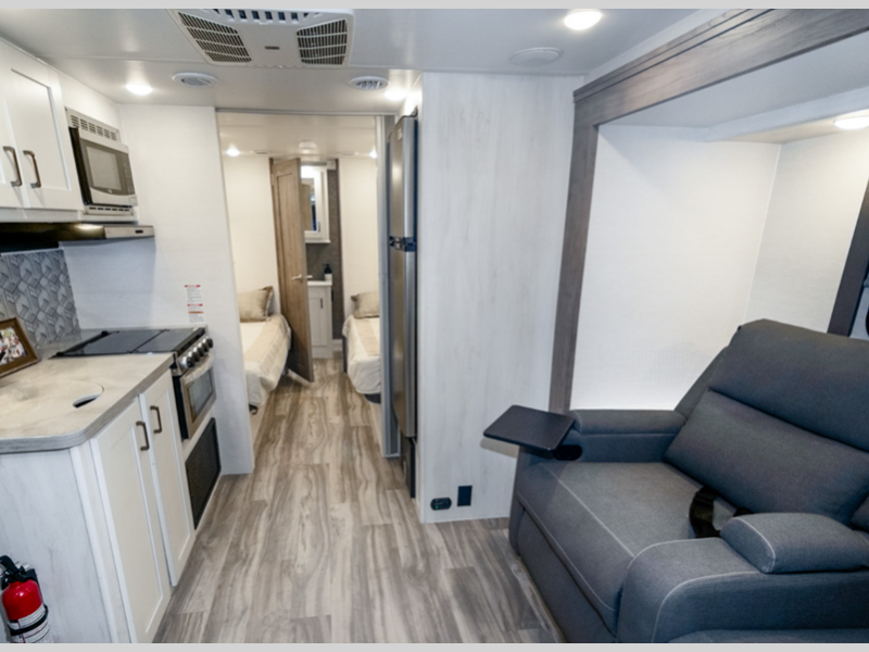 Sleeps 3 Slides 1 Length 28 ft 9 in Ext Width 8 ft Ext Height 10 ft 6 in Int Height 6 ft 5 in Interior Color Smoke, Fog Exterior Color Standard Graphics, Full Paint Option, Partial Paint Option GVWR 14500 lbs Dry Weight 10779 lbs Cargo Capacity 3721 lbs Fresh Water Capacity 37 gals Grey Water Capacity 32 gals Black Water Capacity 32 gals Furnace BTU 25000 btu Generator 4.0 kW Enclosed Fuel Type Gasoline Engine 7.3L V8 Chassis Ford E-450 Fuel Capacity 55 gals Available Beds RV Queen Refrigerator Type 12V Double Door Refrigerator Size 8 cu ft Cooktop Burners 3 Number of Awnings 1 LP Tank Capacity 42 lbs Water Heater Type Tankless AC BTU 13500 btu Awning Info Power w/LED Lights & Speakers Shower Type Standard Similar Floorplans