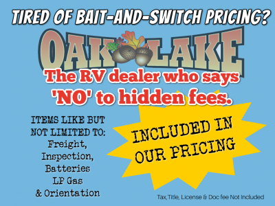 Oak Lake RV is not responsible for any misprints, typos, or errors found in our website pages. Any price listed excludes sales tax, registration tags, and delivery fees. Manufacturer pictures, specifications, and features may be used in place of actual units on our lot. Please contact us @218-485-9900 for availability as our inventory changes rapidly. All calculated payments are an estimate only and do not constitute a commitment that financing or a specific interest rate or term is available.